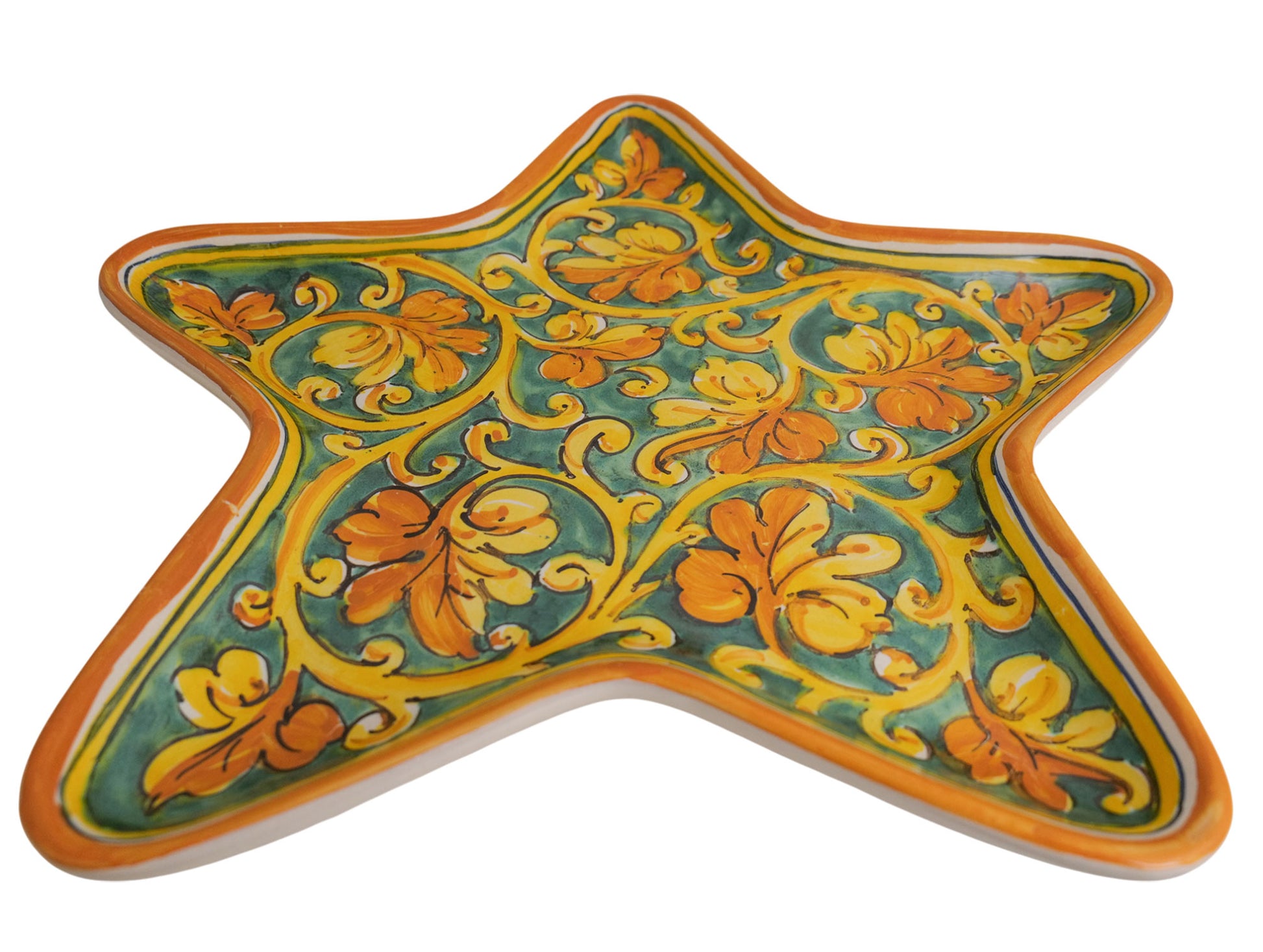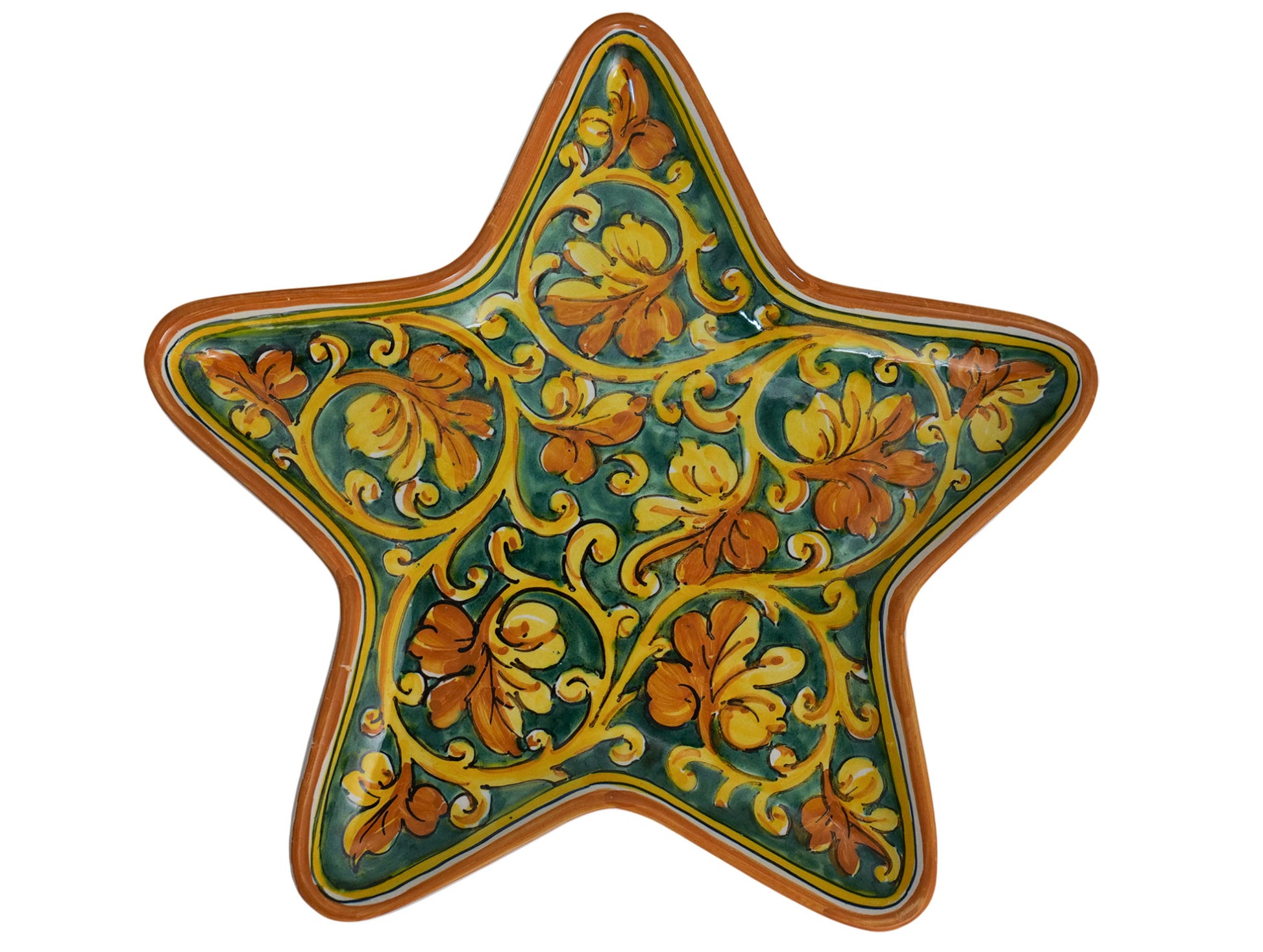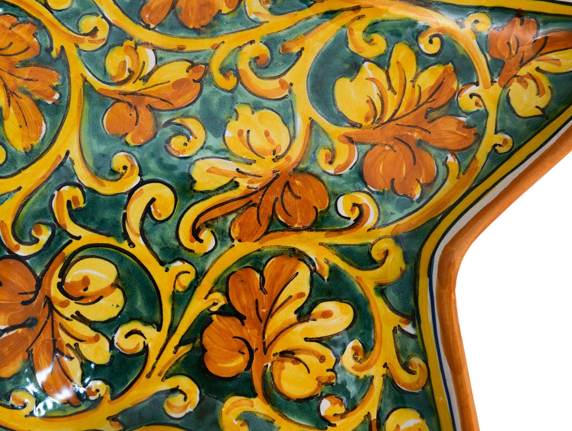 Piatto vassoio a stella con decorazione barocca di Palermo . Interamente dipinto a mano nel nostro laboratorio di Palermo si tratta della rielaborazione di una foglia di vite con andamento a spirale su fondo verde