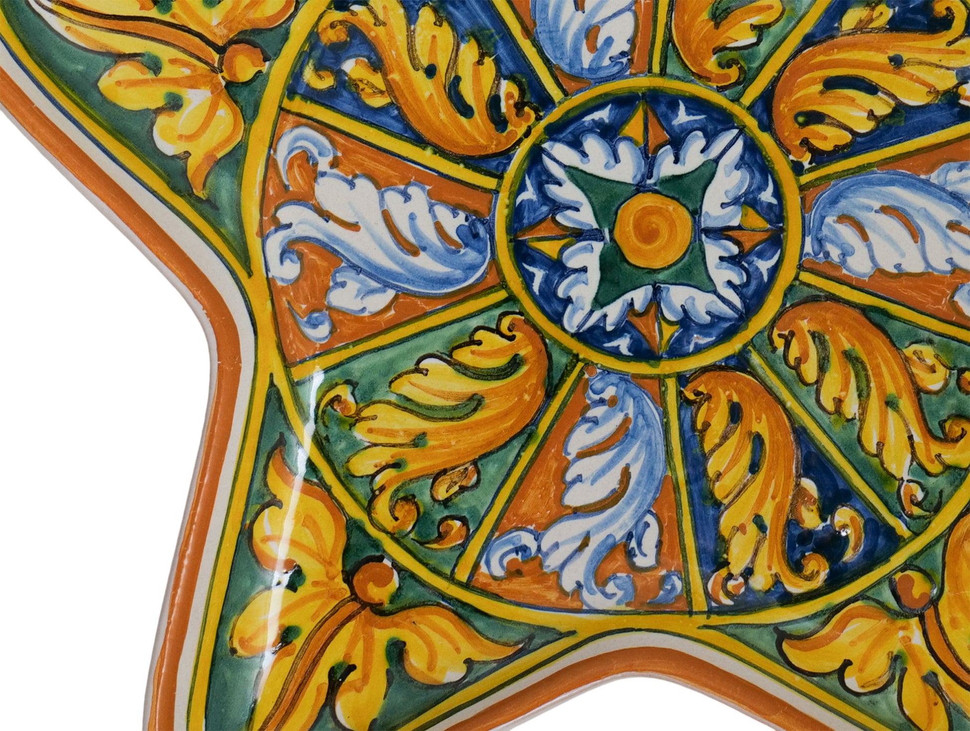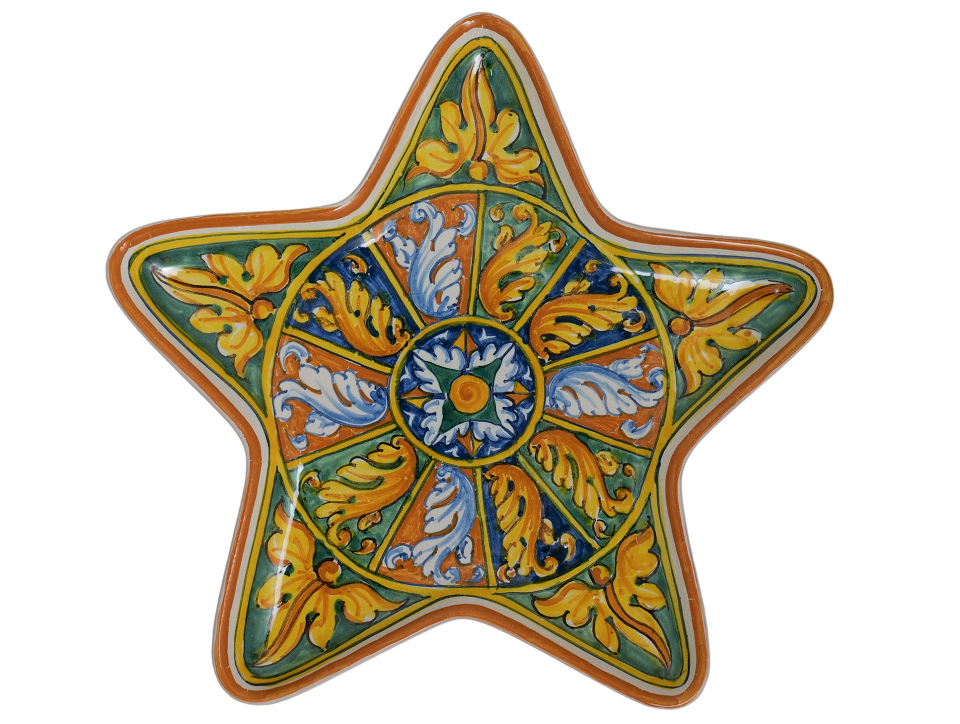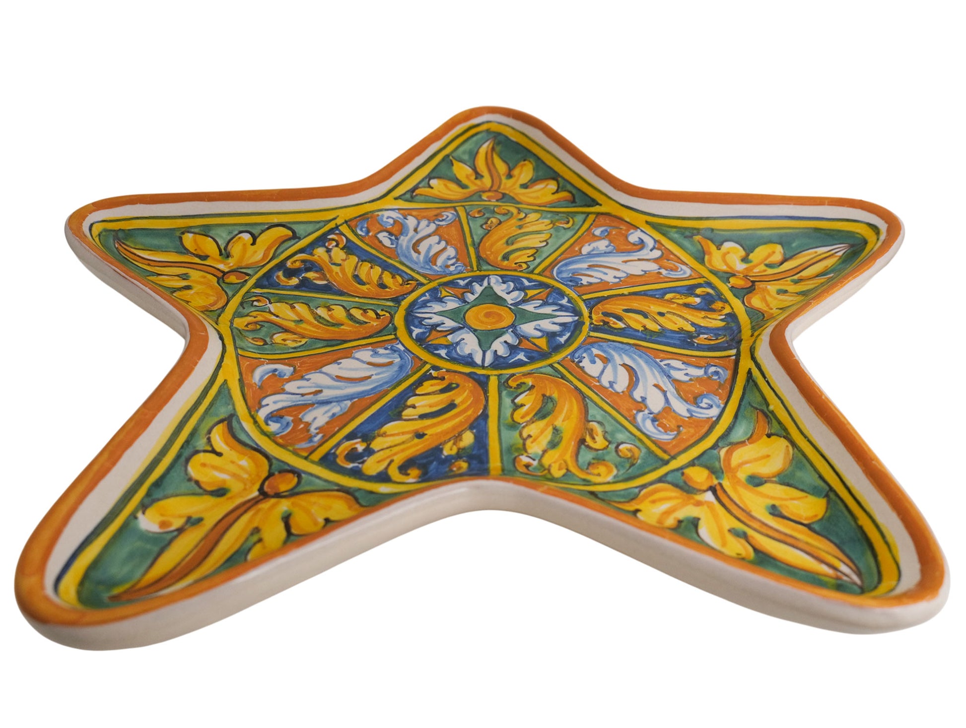 Piatto vassoio a stella con decorazione barocca di Palermo . Interamente dipinto a mano nel nostro laboratorio di Palermo si tratta della rielaborazione di una foglia d'acanto inscritta in quartieri di fondo blu, verde ed ocra.